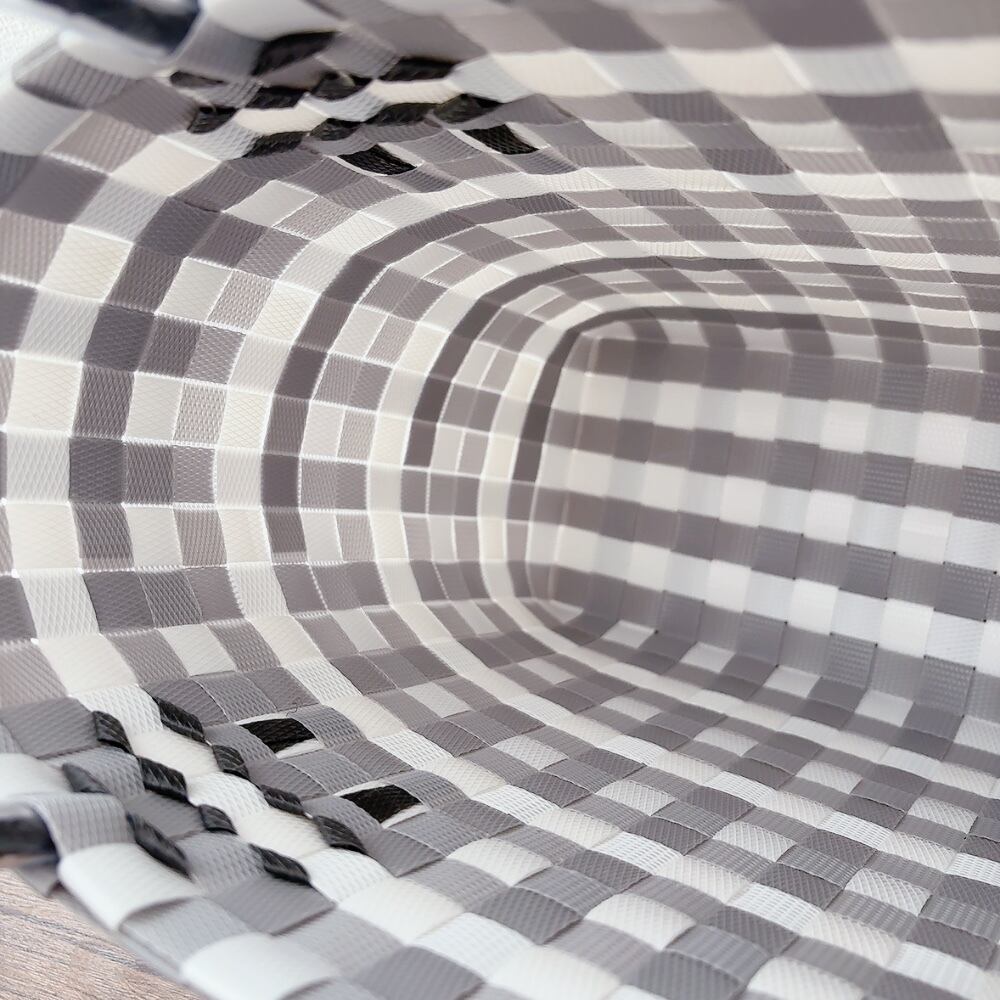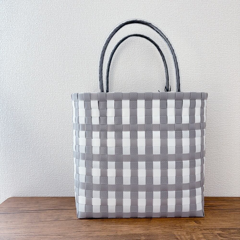 爽やかなホワイトとシックなグレーの組み合わせが魅力の手作りプラかごバックです!